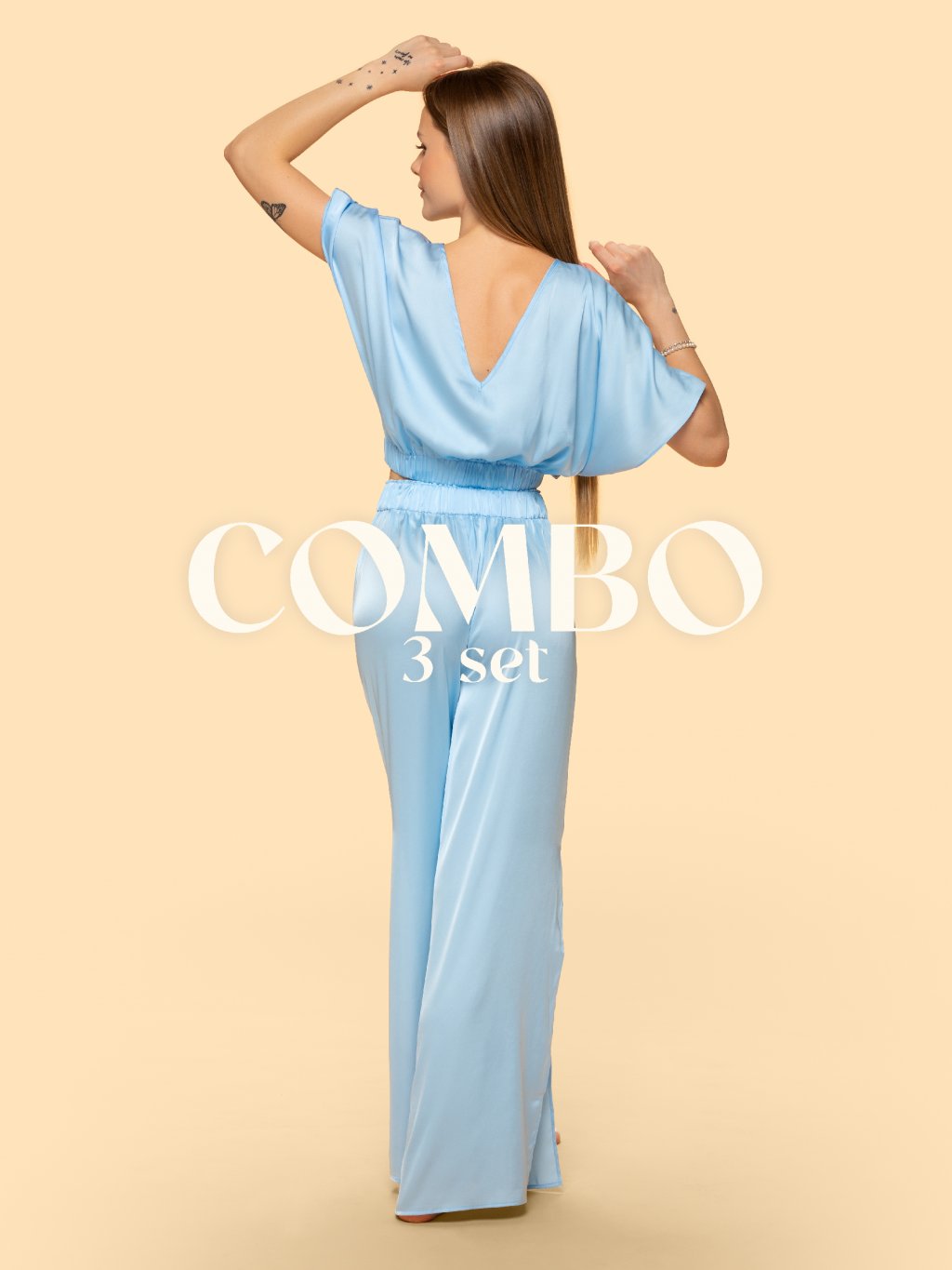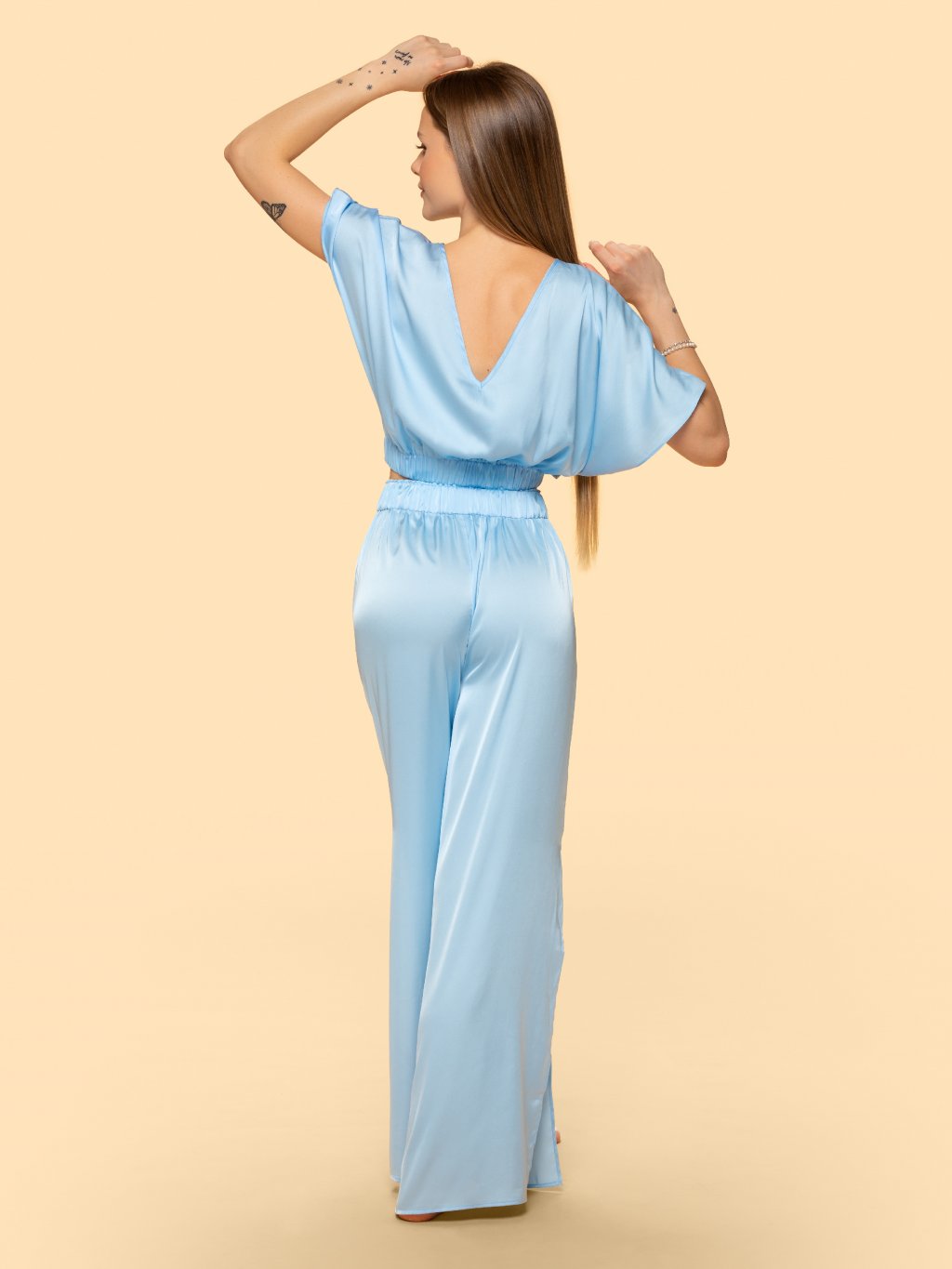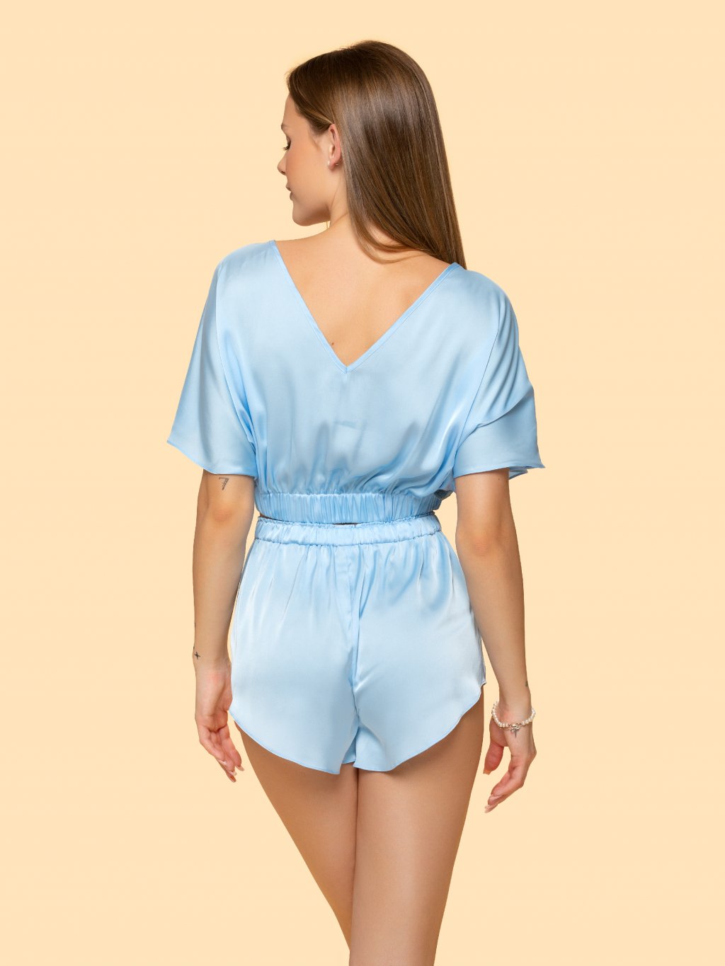 COMBO - Dámsky saténový set FANCY V - V top + Pants + Shorts - baby modrá