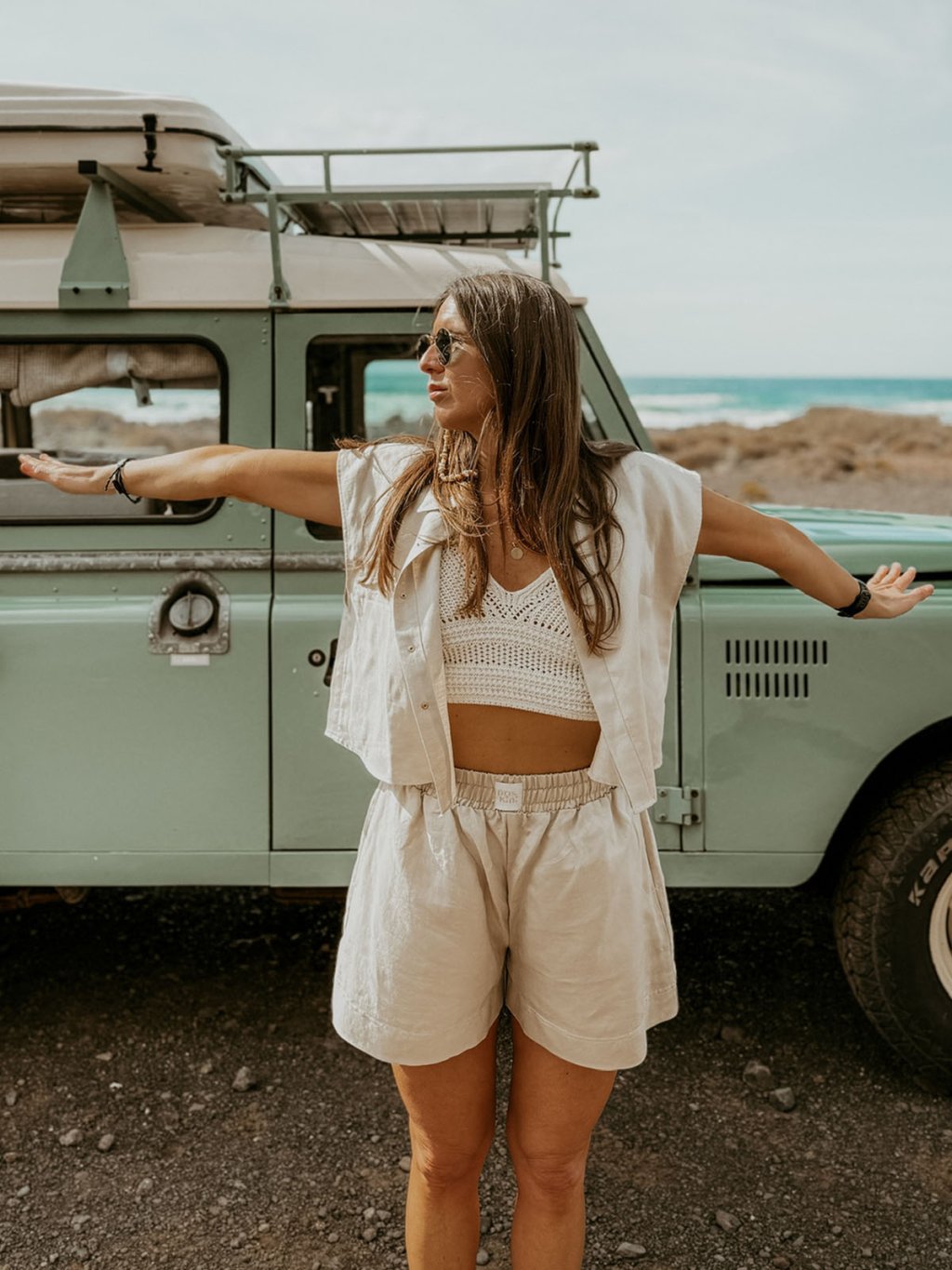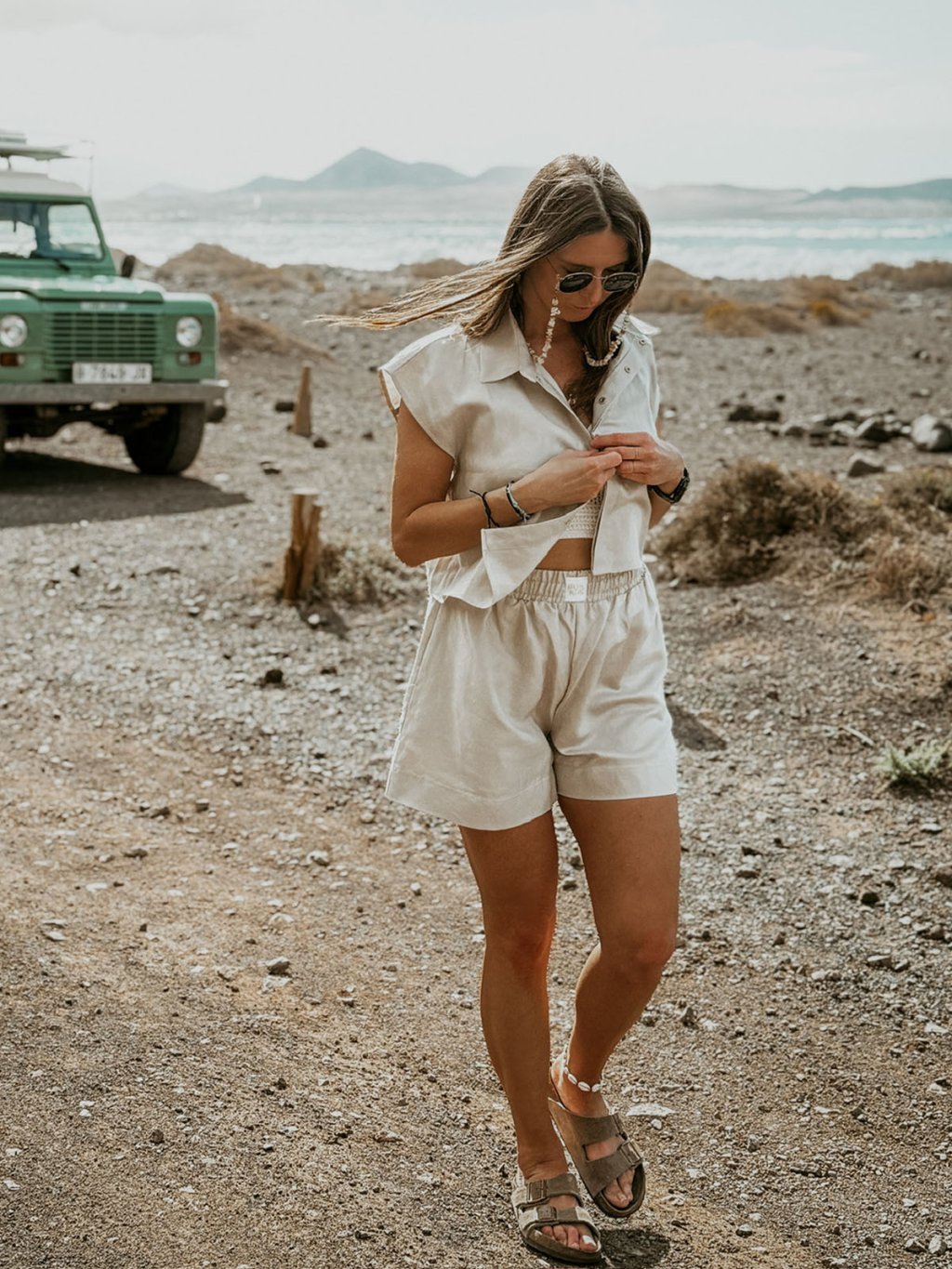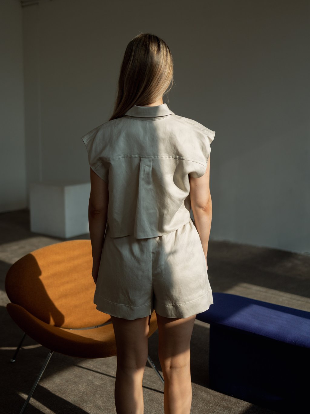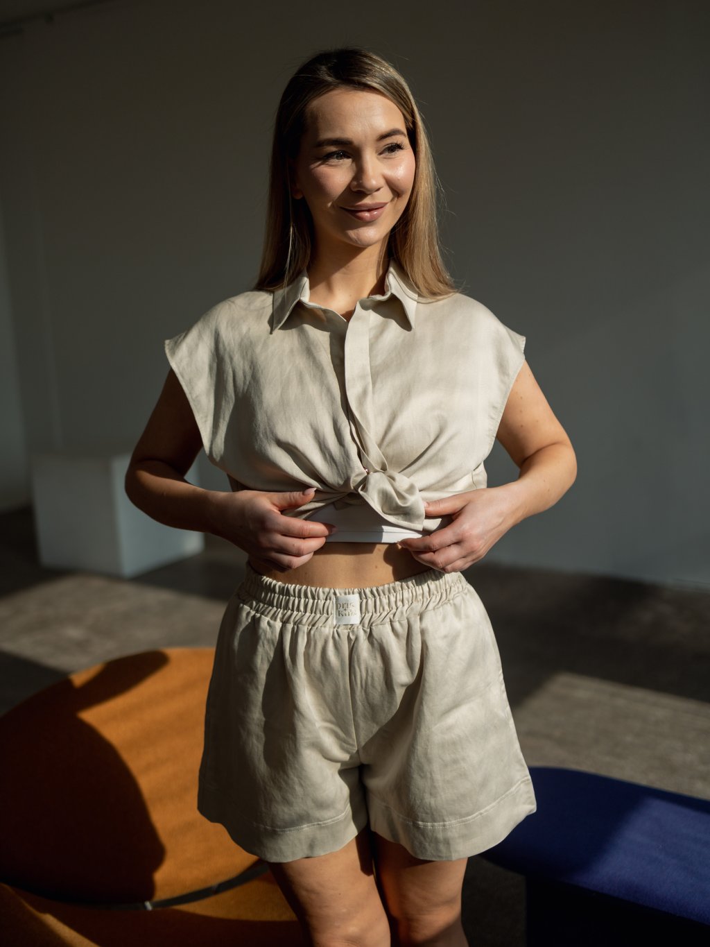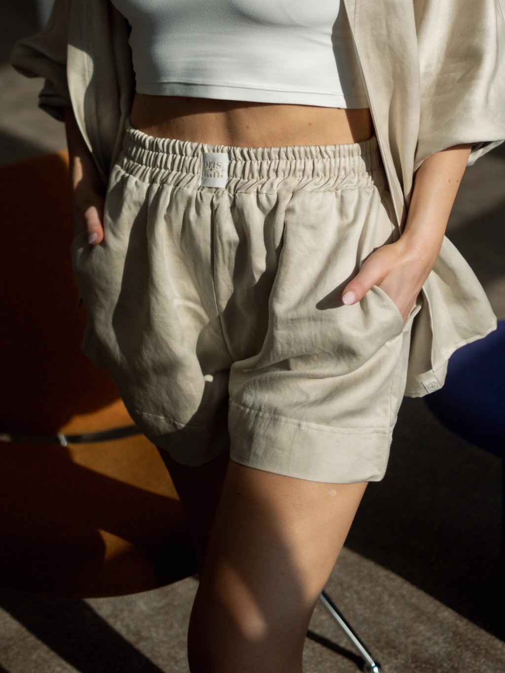 Dámske tenclovo - ľanové kraťasy Priskini z kolekcie Tencel - Linen sú jemné a vzdušné, ideálne na každodenné nosenie počas teplejších dní. Kraťasy majú hrubšiu gumu v páse a praktické vrecká. Kraťasom sme pridali aj hrubšiu záložku, čo dodáva ešte luxusnejší vzhľad.