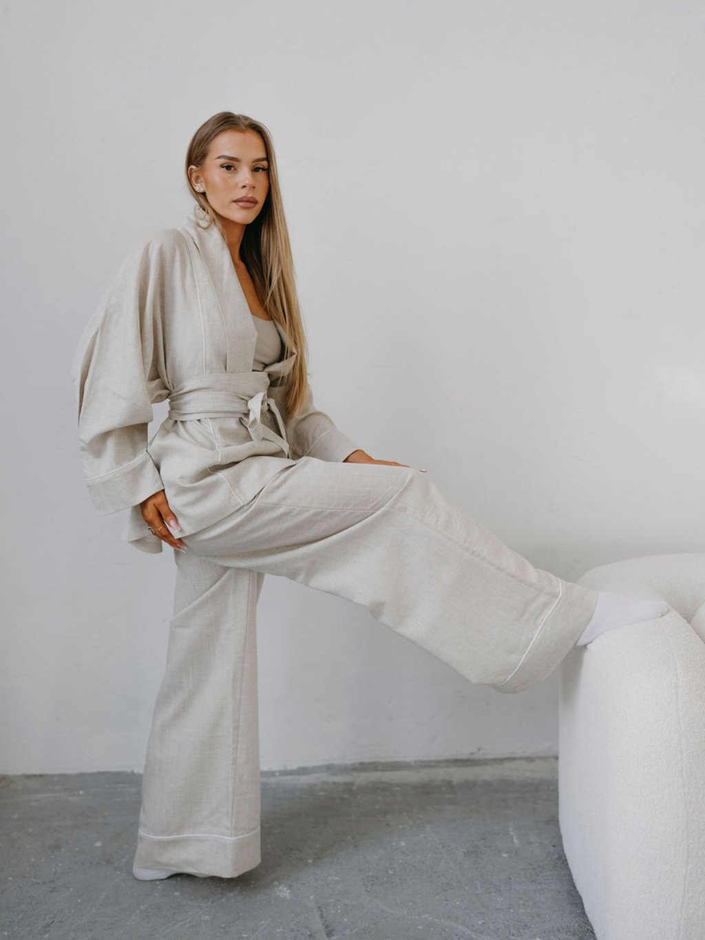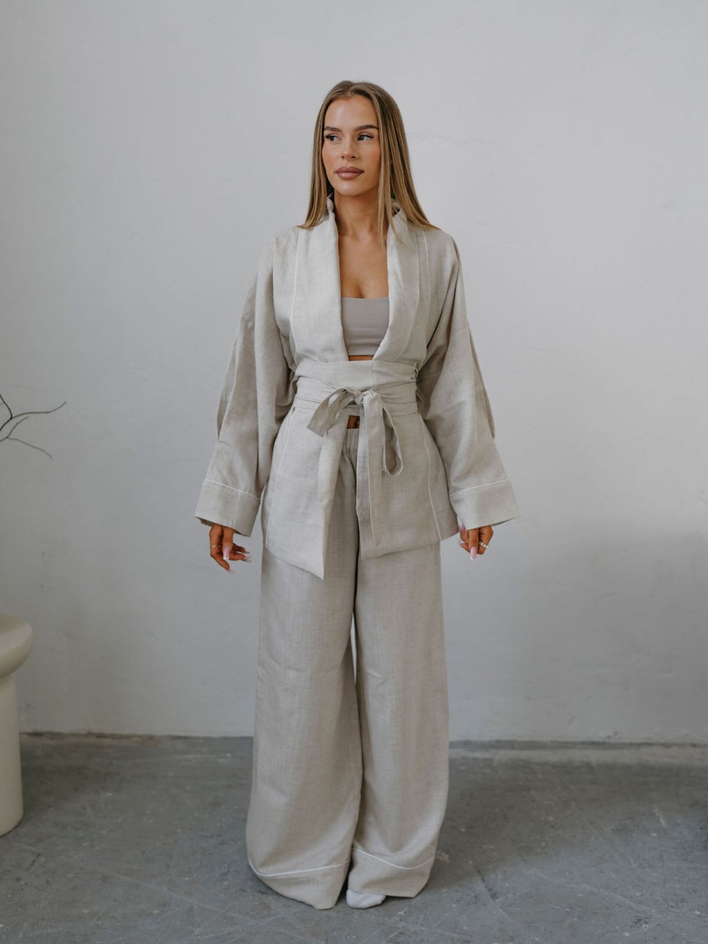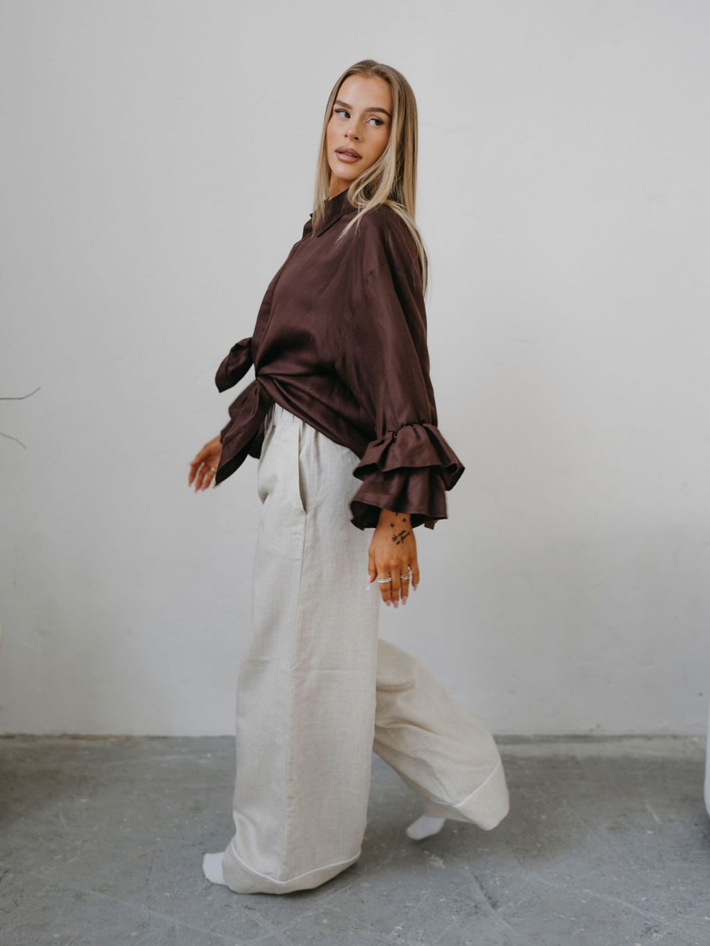 Wide RAW nohavice Priskini sú širšieho strihu (rovné, pôsobiace ako zvonové), majú jemný pás, pôsobia elegantne a prémiovo. Nohavice majú širokú záložku s jemným paspulkovým pásikom. V porovnaní s ľanovými kúskami je materiál hebkejší a ľahší a pôsobí luxusnejšie, čo zaručujem Lyocell a je trochu menej krčivý ako čistý ľan.