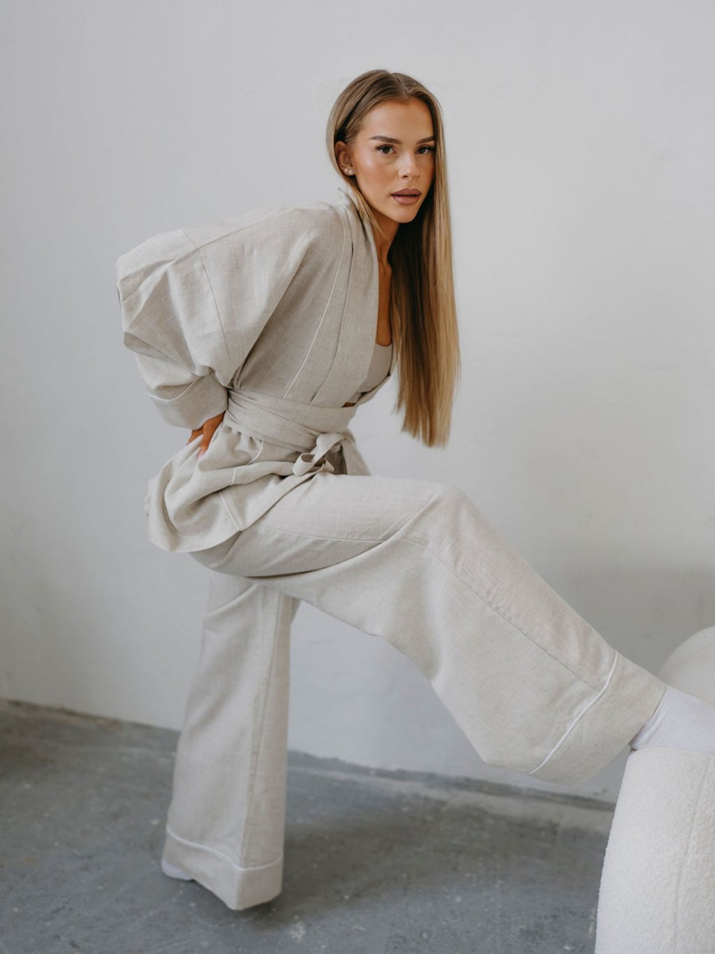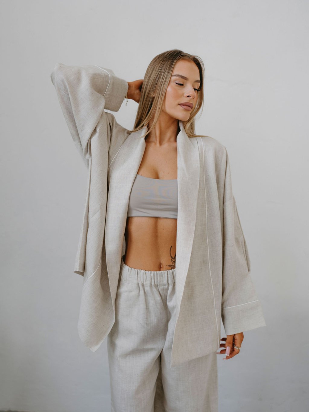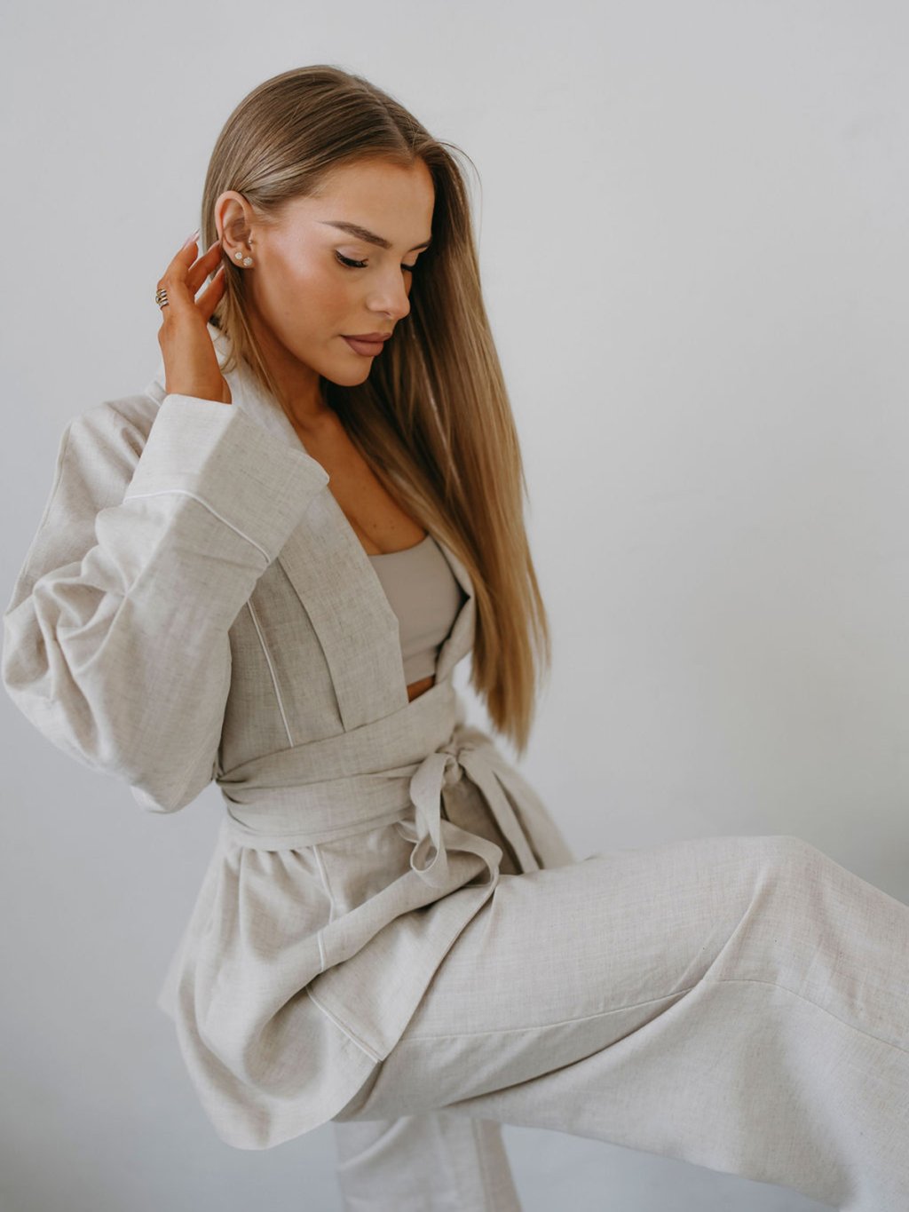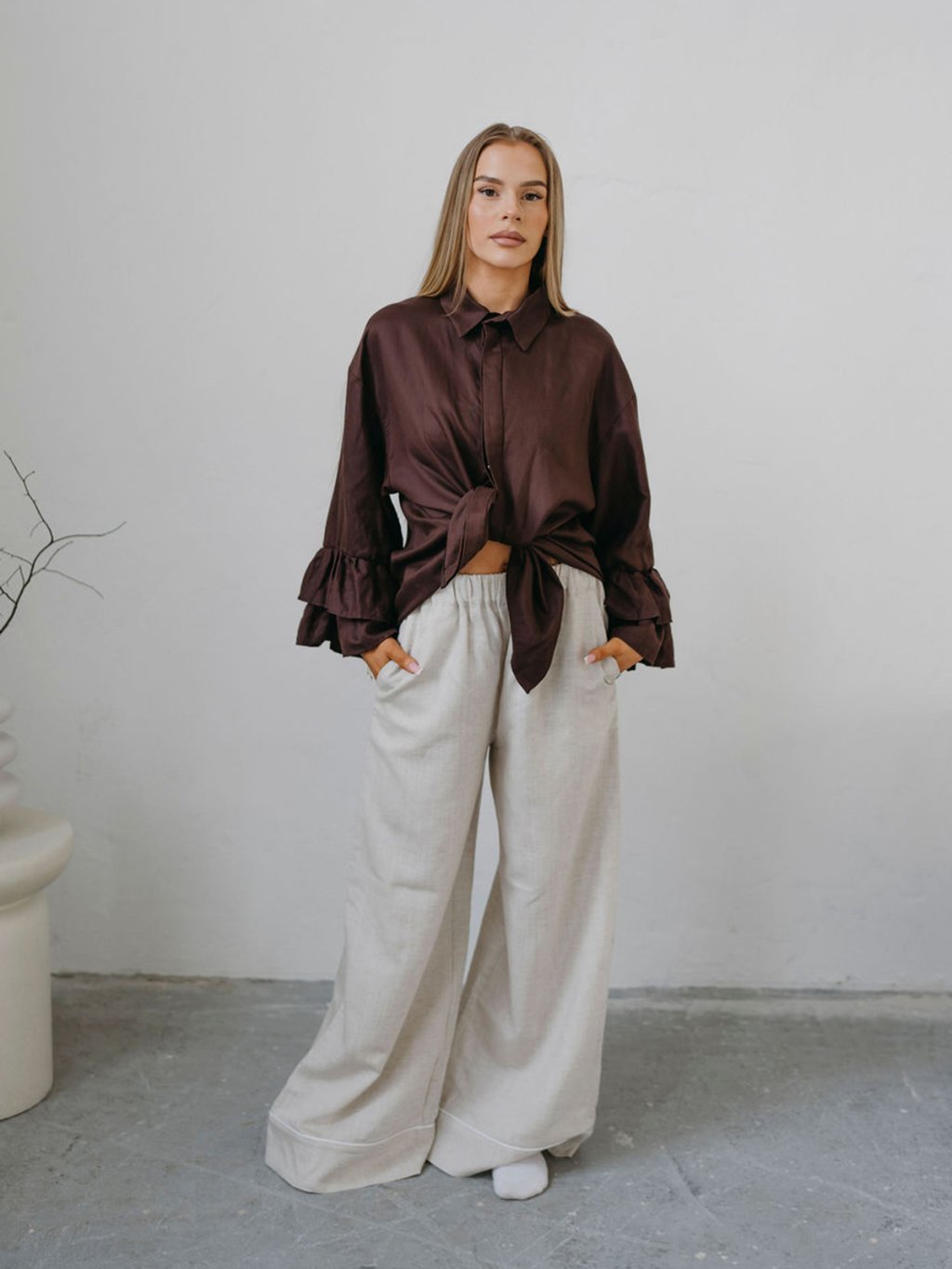 Wide RAW nohavice Priskini sú širšieho strihu (rovné, pôsobiace ako zvonové), majú jemný pás, pôsobia elegantne a prémiovo. Nohavice majú širokú záložku s jemným paspulkovým pásikom. V porovnaní s ľanovými kúskami je materiál hebkejší a ľahší a pôsobí luxusnejšie, čo zaručujem Lyocell a je trochu menej krčivý ako čistý ľan.