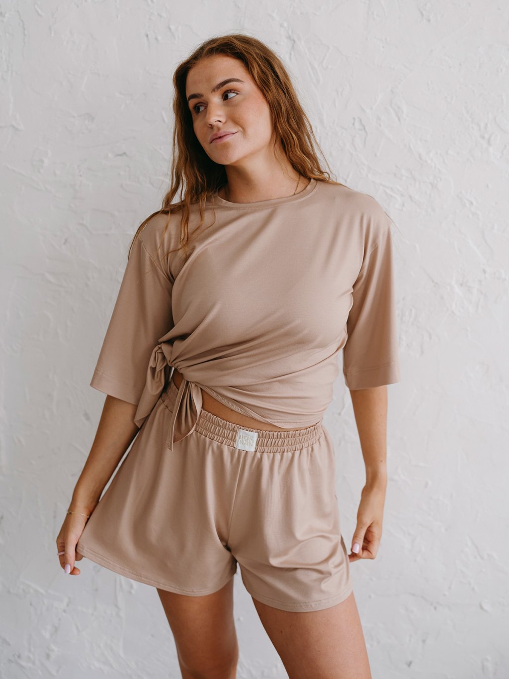 Priskini pyžamový set ELLE sa skladá z topu, ktorý môžes nosiť voľne padnutý alebo ho vďaka rozparku na dlhšej, šikmej strane uviazať na uzol a skrátiť podľa potreby. Alebo tričko / top zaprav na jednej strane, prípadne celé. Kreativita je už na tebe :)