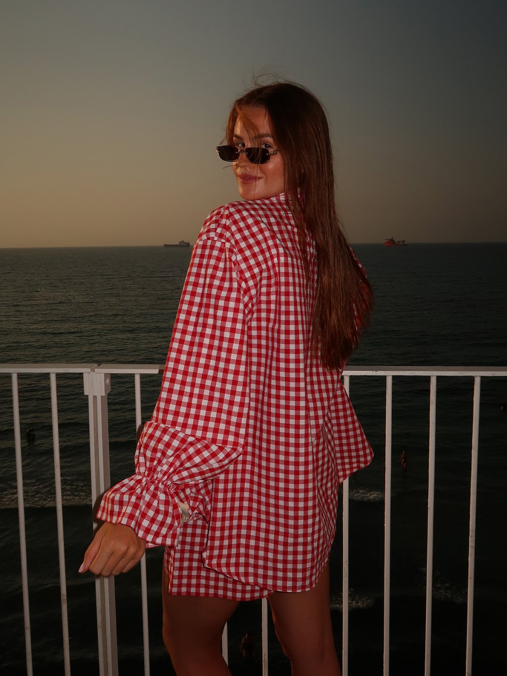 Krásna Priskini Chéry košeľa je vo veľkosti One size. Perfektne sadne od veľkosti XS - XL. Má voľný a šatový-kruhový strih, rukávy s gumičkou, ktoré si jednoducho vytiahneš vyššie a prispôsobíš svojmu štýlu. Zapínanie je na jemné cvoky.